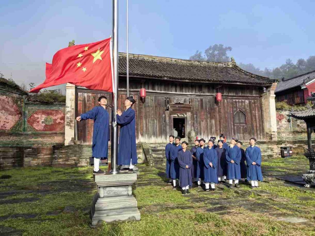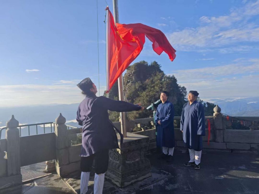 在国庆节即将来临之际,武当山道教协会各宗教活动场所纷纷举行迎国庆升国旗仪式,庆祝中华人民共和国成立76周年,用实际行动表达“与党同心,与国同行”的爱国情怀。