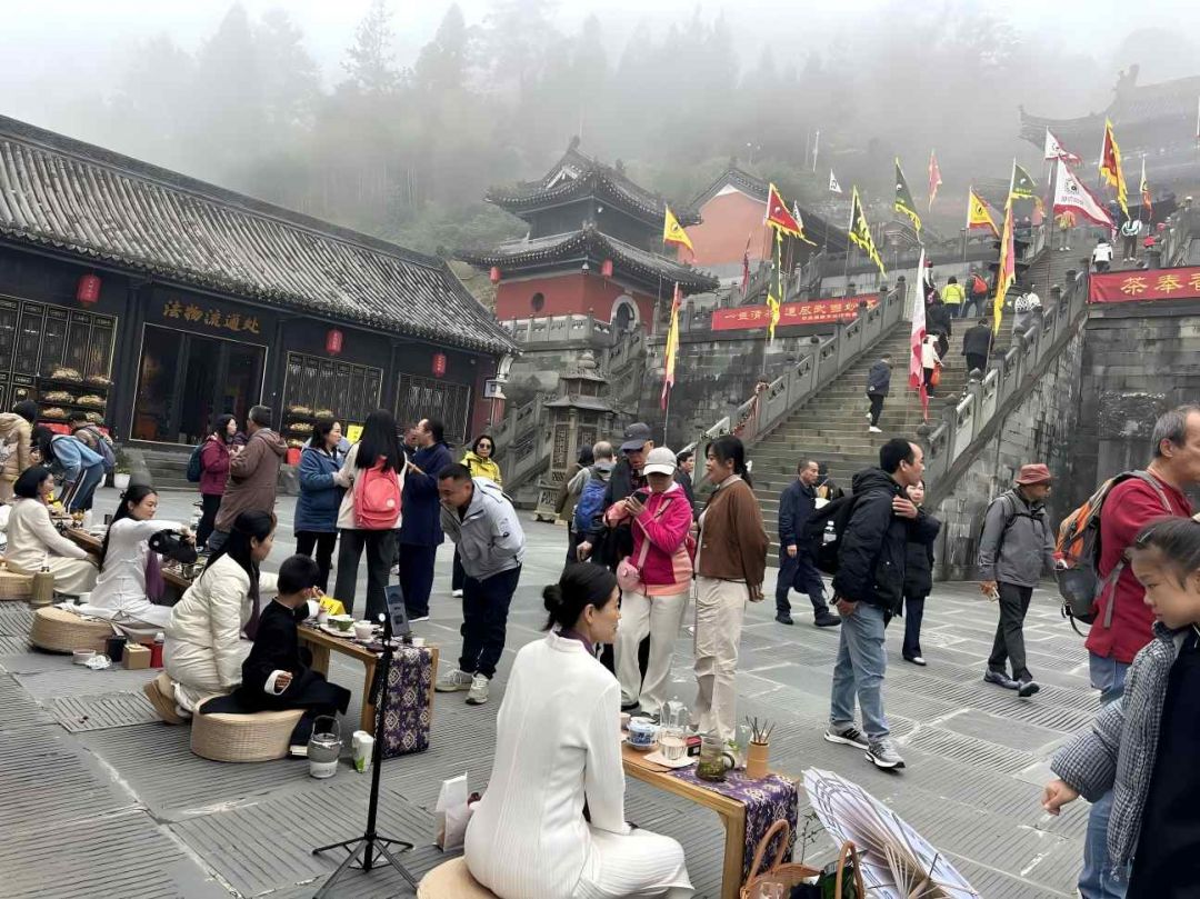 值得一提的是,今年重阳节与真武祖师圣诞重合,使得武当山迎来了朝圣高峰,游客量显著增长。景区内道教文化展示活动丰富多彩,武当道家文化研究会在武当山琼台中观组织的公益茶艺展演活动,吸引了众多游客参与。
